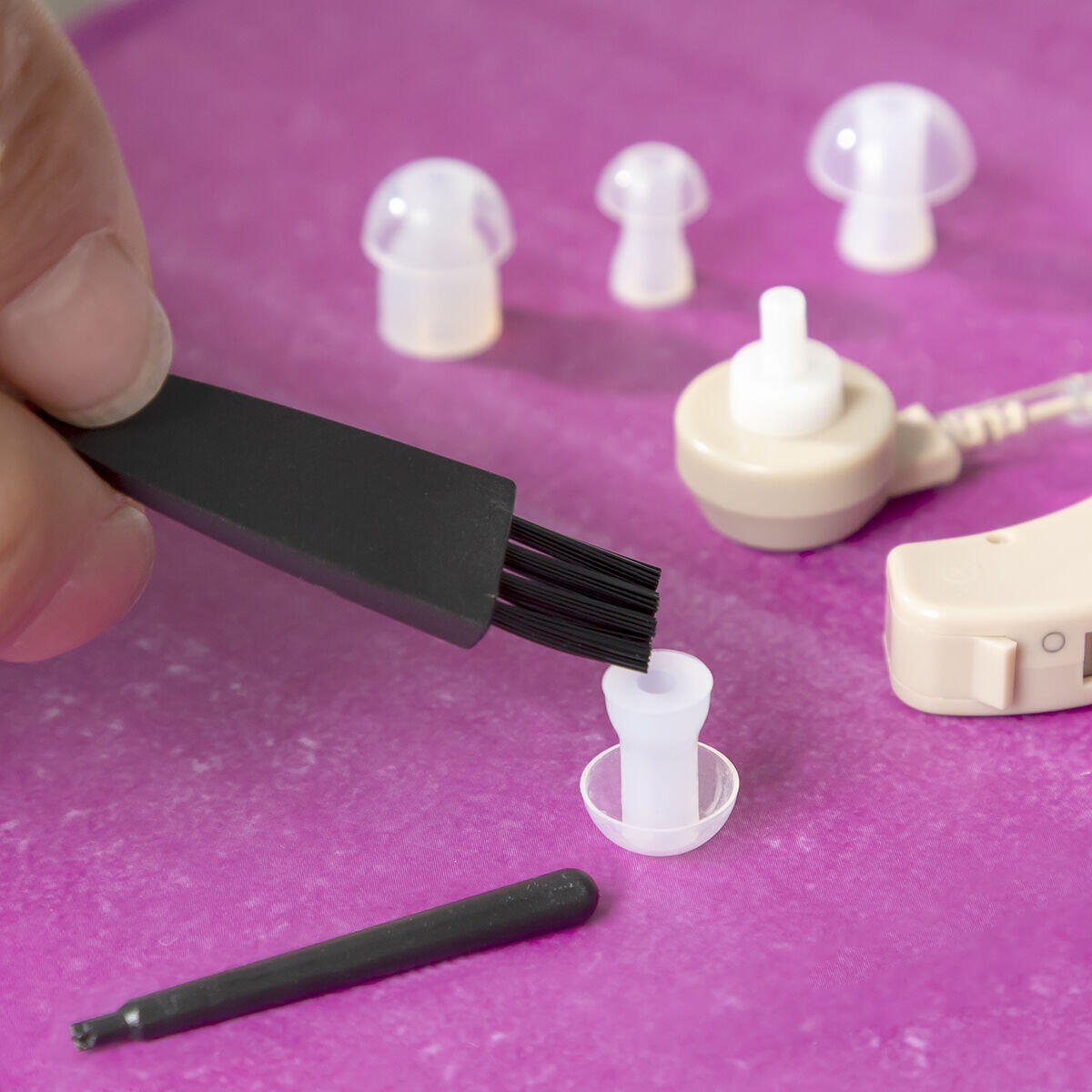Un completo set auditivo que incluye 1 amplificador de sonido, 1 bastoncillo y 1 cepillo de limpieza, 4 almohadillas de silicona para mejor ajuste al conducto auditivo, 2 pilas A13 (una de repuesto) y estuche para guardar y llevar a cualquier parte donde se necesite con facilidad y comodidad.