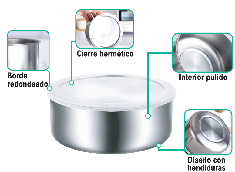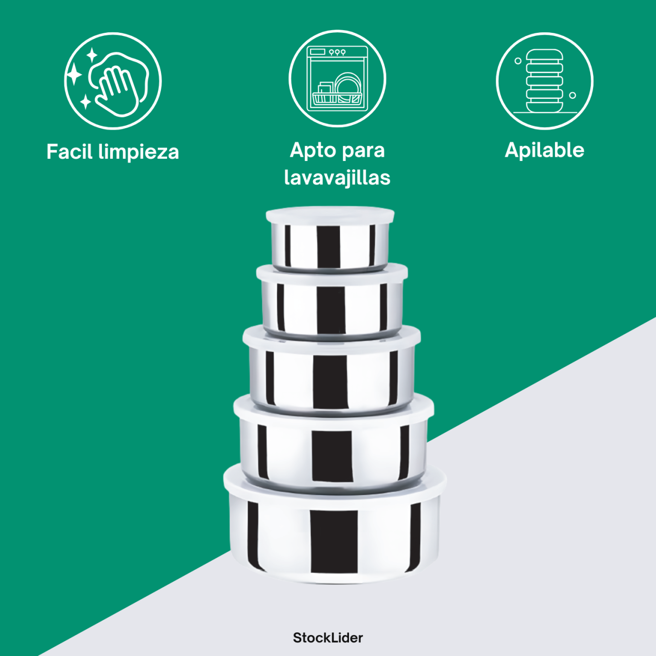 El Set de 5 Recipientes está diseñado para quienes valoran la practicidad sin renunciar a la calidad. Fabricados en acero inoxidable 304 de grado alimenticio, estos recipientes son seguros, duraderos y resistentes al uso diario. Ideales para conservar frutas, verduras, comidas preparadas y mucho más.